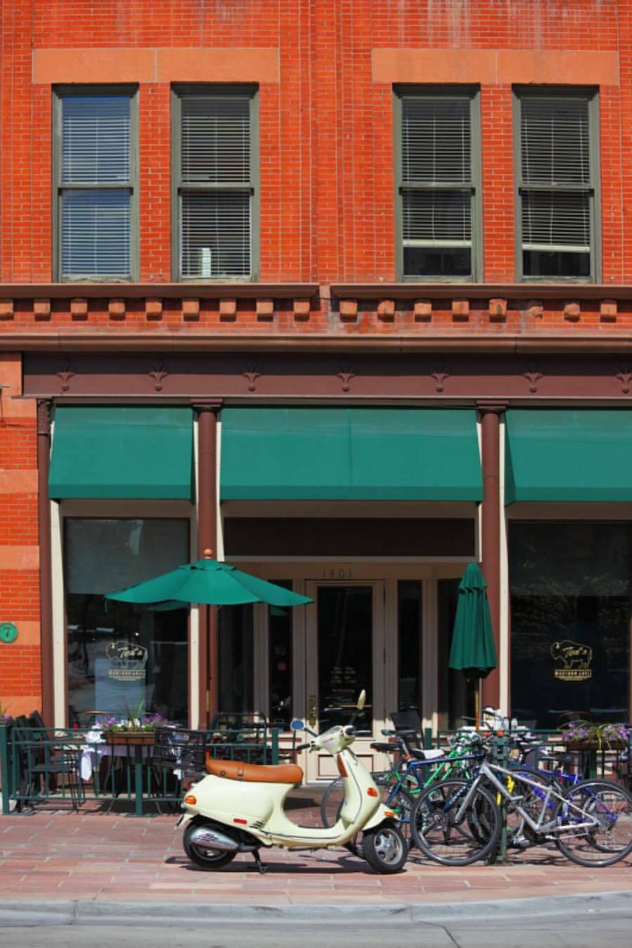 Denver, Colorado, USA - September 2, 2011: A Vespa scooter and bicycles are parked outside a restaurant on Larimer Street in the popular historic LoDo district.
